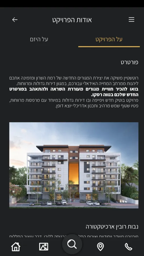 באפליקציה תוכל לקבל בלחיצת כפתור חווית תלת מימד של סביבת הפרויקט ושל הדירות המוצעות למכירה. האפליקציה מאפשרת לקבל נתונים לגבי הדירה המבוקשת לפי מסננים של גודל, מחיר, מיקום ועוד... ולעבור סיור תלת ממדי מרהיב בתוך הדירה ובסביבת הפרויקט החיצונית.