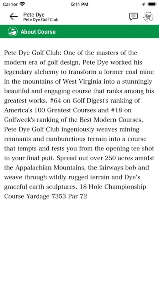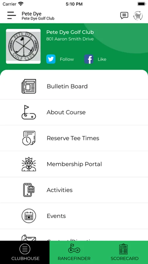 Pete Dye GC gives you access to an on-course rangefinder, live scoring system, course information, weather updates, tee-time booking service, and messaging systems functions. Additionally, the Pete Dye GC app may be used to sign up for events, view your membership portal, order food and beverage, and receive course promotions at Pete Dye GC.