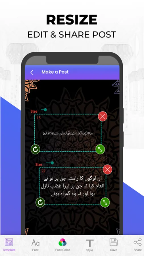 Edit your images with Islamic post creator and save selected verses of the Quran as an image on your device.