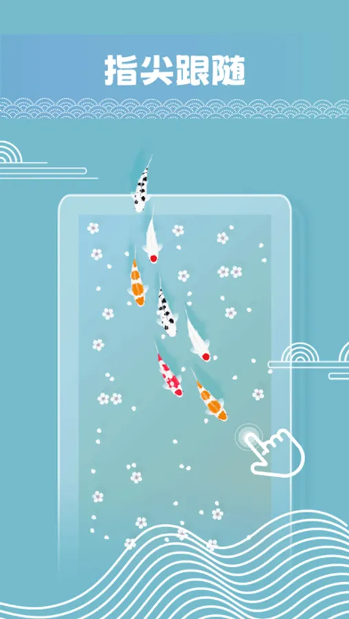 * 指尖在屏幕上轻点或滑动时,花叶随水波荡开,鱼儿便被吸引而来,随指尖的划动轨迹游动,灵动有趣。