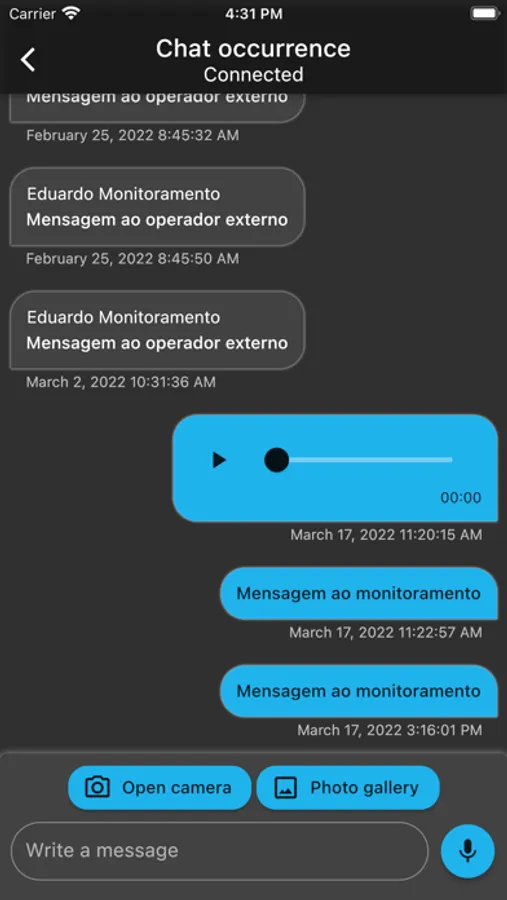 - Chat to exchange messages and direct audio with the Monitoring Center Operator;
