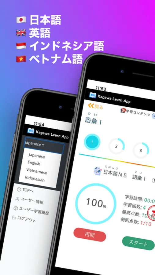 英語、ベトナム語、インドネシア語、日本語に切り替え可能なので、あなたが好きな言語で学ぶことが可能です。