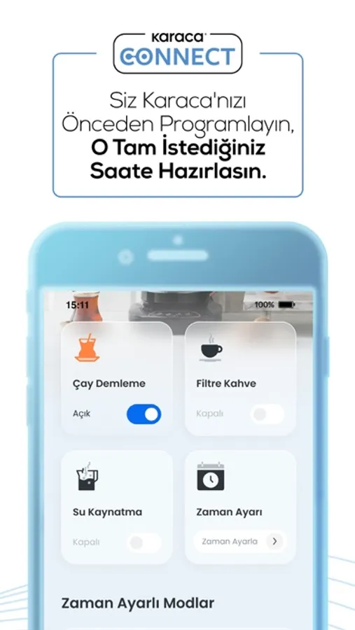 - Karaca Connect ile zamanınızı daha verimli kullanabilirsiniz. Cihazınızı istediğiniz saate göre ayarladıktan sonra Zamanlayıcı özelliği ile cihazınızı uzaktan çalıştırın ve gerisini Karaca'nıza bırakın. Tüm istekleriniz sizin belirlediğiniz zamanda hazır olsun!