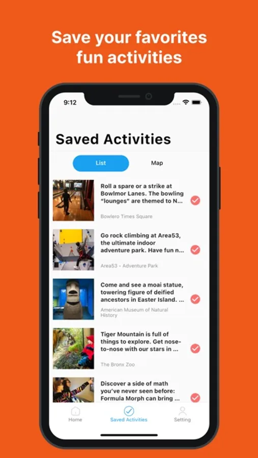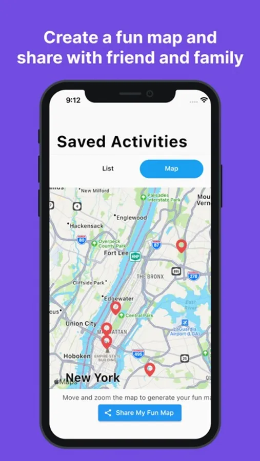 Share activities with your friends and family. This will help you to start a conversation about where to go and when. You can simply click on the sharing icon at the bottom of each activity. The sharing text will include the title of the activity, the photo, and a link to the app. You can also share a collection of activities on a map. Simply save the activities you like, and then from the saved activities screen, select the map tab and share the map with your friends and family.
