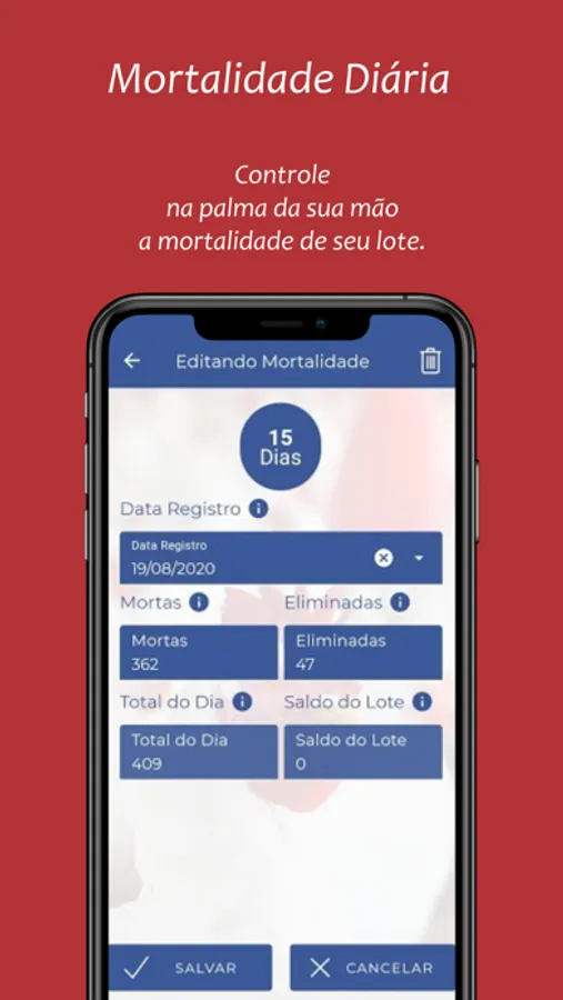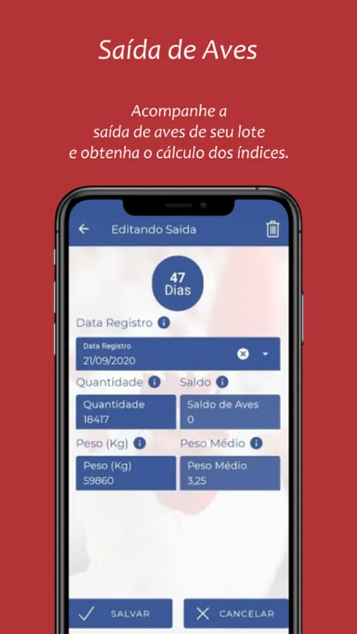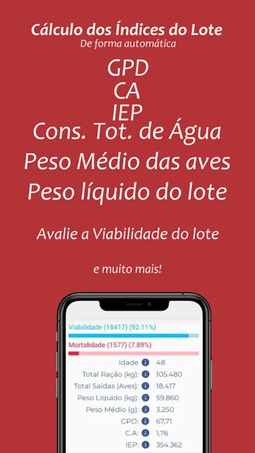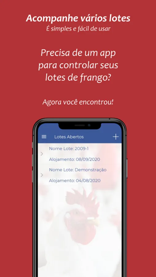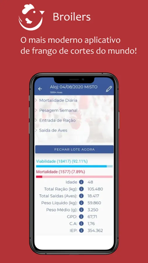 Este aplicativo de frango de corte é destinado para produtores de frango de corte para acompanhar o dia a dia dos lotes, registrando a sua pesagem semanal, mortalidade diária, entrada e saída de ração e seu fechamento do lote. É possível gerar os indicadores de IEP (Índice de Eficiência Produtiva), GPD (Ganho de Peso Diário), percentual de mortalidade, conversão alimentar, peso médio e muitos índices de produtividade.