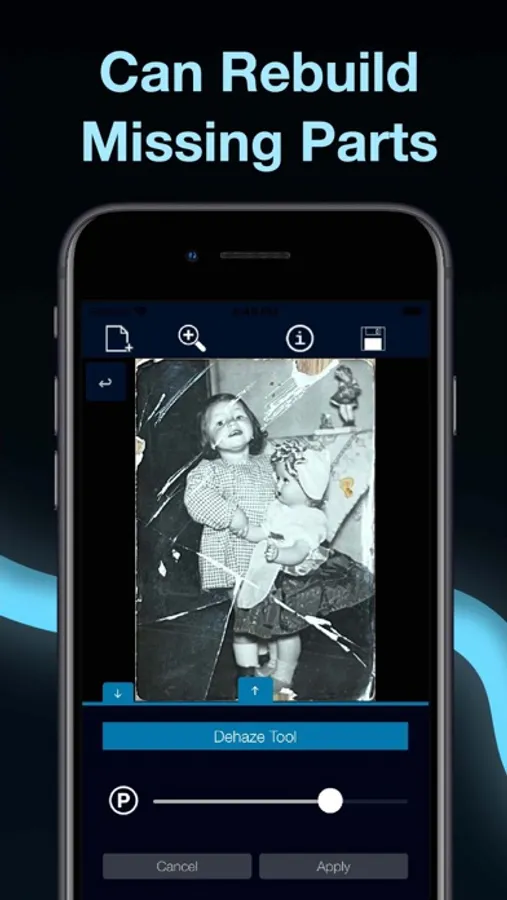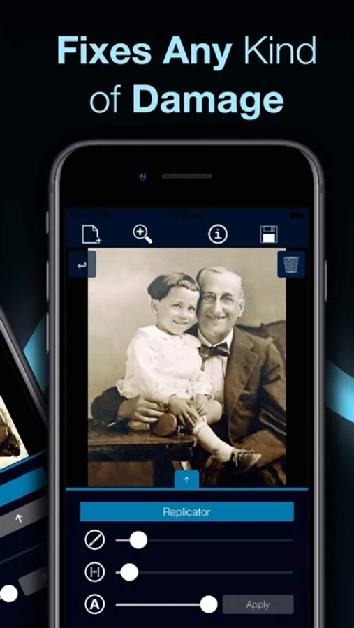 Fix your damaged photos, remove cracks, rips, imperfections, stains, any kind of damage and rebuild missing parts, not only on old black and white photos but also on recent colored ones, in few taps!