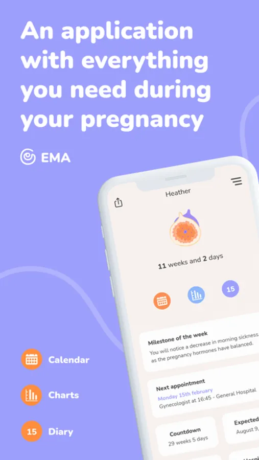 EMA features a pregnancy calendar and diary with medical appointments, photos, and tracking of symptoms and emotions. It also includes useful information about pregnancy, weekly blog articles, and tips on mother care so you can track your baby's growth week by week.