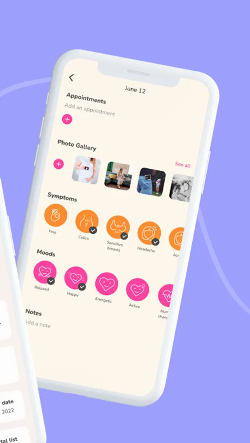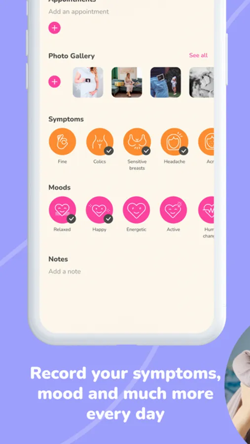 Add photos and record your symptoms in a diary you can consult whenever you want, so you can keep track of your day-to-day pregnancy journey.