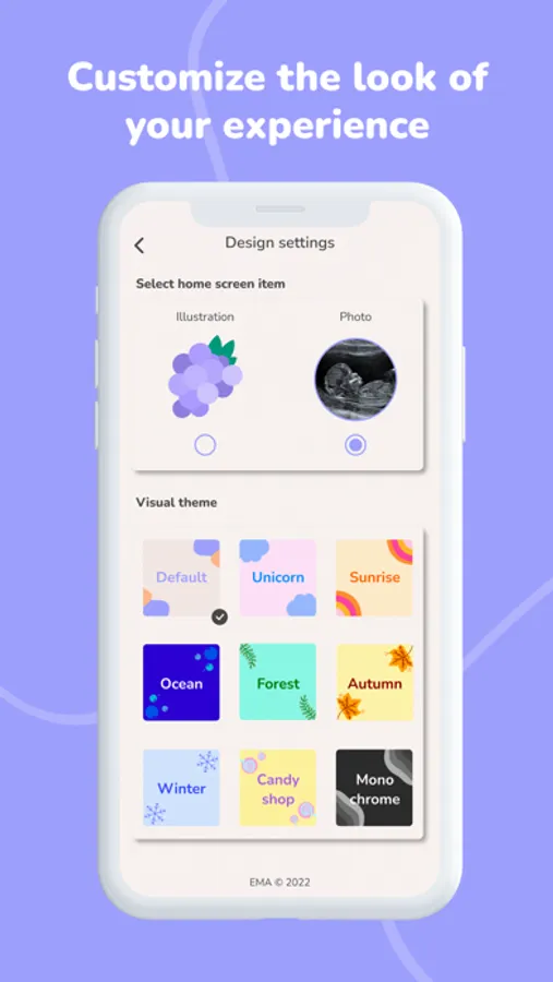 With this beautiful and well-designed pregnancy tracker app, you'll have a personalized experience. You will be able to change the visual theme to choose the one you like the most. Customization allows you to feel that the app is designed for you and your needs.