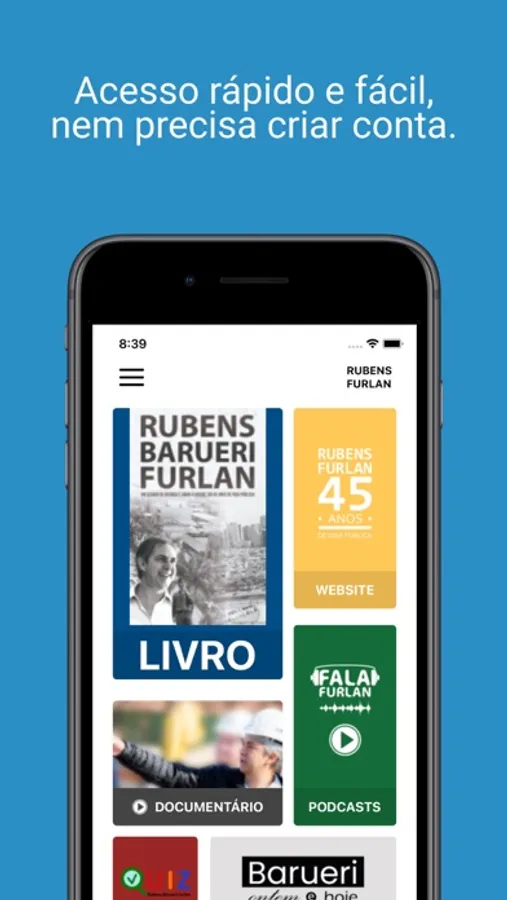 Dedicado aos 45 anos de vida pública de Rubens Furlan, vereador, deputado estadual, deputado federal e seis vezes prefeito de Barueri, na Grande São Paulo, hoje uma das mais importantes cidades brasileiras. A ideia inicial era um livro físico cujo título – RUBENS BARUERI FURLAN – expressa a relação de amor, ousadia e responsabilidade para com a cidade que o acolheu quando ainda garoto.