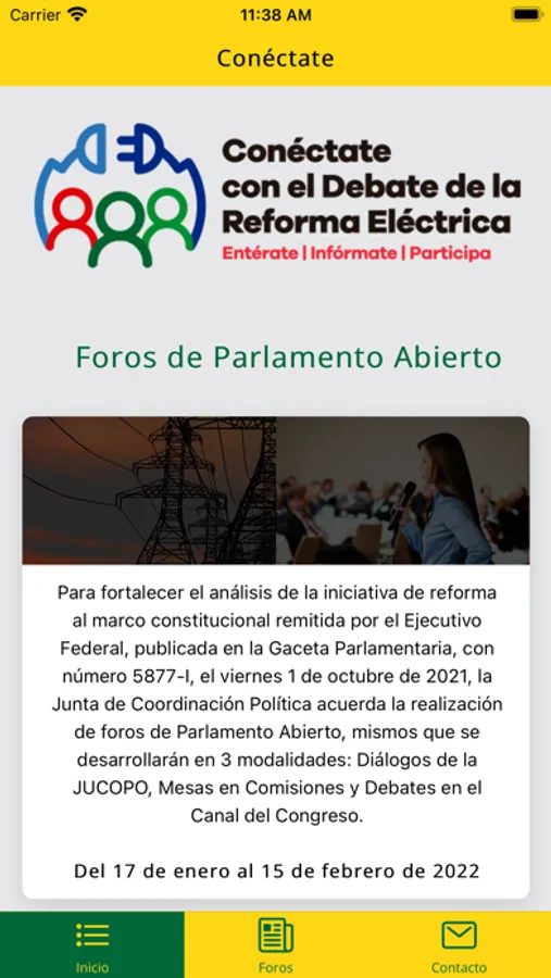 Conéctate con el debate de la reforma eléctrica. Aplicación que busca difundir los foros de parlamento abierto organizados por la cámara de diputados del congreso de la unión.
