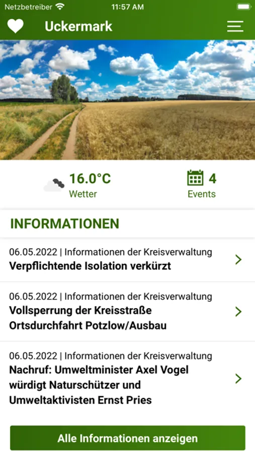 Die Uckermark App ist ein Informationsportal der Kreisverwaltung. Hier finden Sie aktuelle Informationen, Pressemeldungen und Veranstaltungstipps des Landkreises.