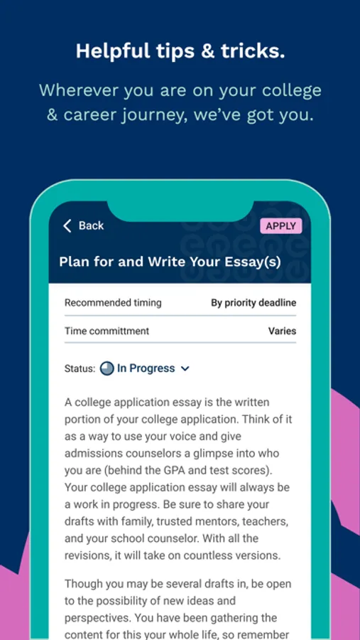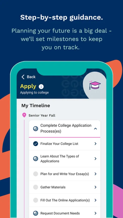 The personalized, step-by-step college guidance puts you in charge. Build skills to help you plan for college that you will carry with you to graduation and beyond. Discover opportunities based on the future you want, such as the perfect scholarships for college. Be informed and organized as you complete your college application. Learn how to make college affordable with a scholarship for college students. Stay on track for your next step after high school and get the perfect college offer for you.