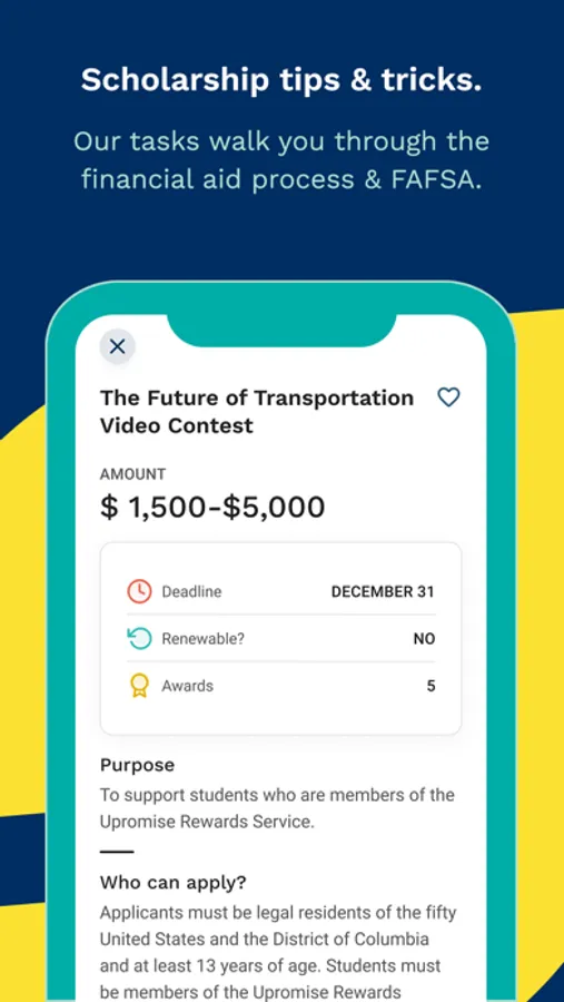 Tasks: Tasks organize your action items based on your graduation year and life beyond high school goals. Tasks walk you through the specifics of everything from preparing yourself for the financial aid process and FAFSA (Free Application for Federal Student Aid) to exploring college and scholarships for college students that are matched through self-discovery, to selecting your future school that'll be lucky to have you.
