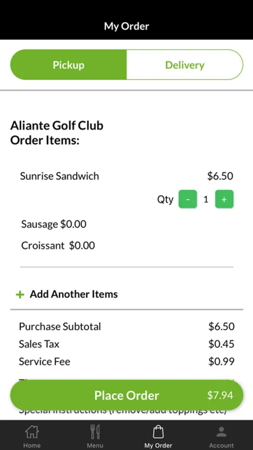 As a user, you'll have the option to choose to have your order delivered to your cart or pick it up at the snack bar.