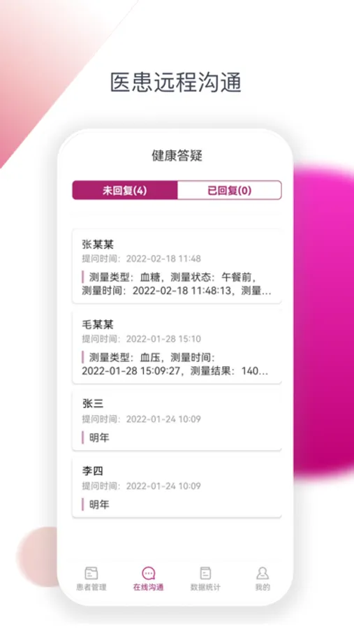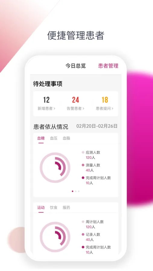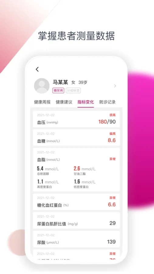 本软件为成年人提供三高慢病管理支持。支持医疗服务提供商查看管理的患者健康信息,运动、饮食、测量记录信息。发送给患者定期任务和健康建议。