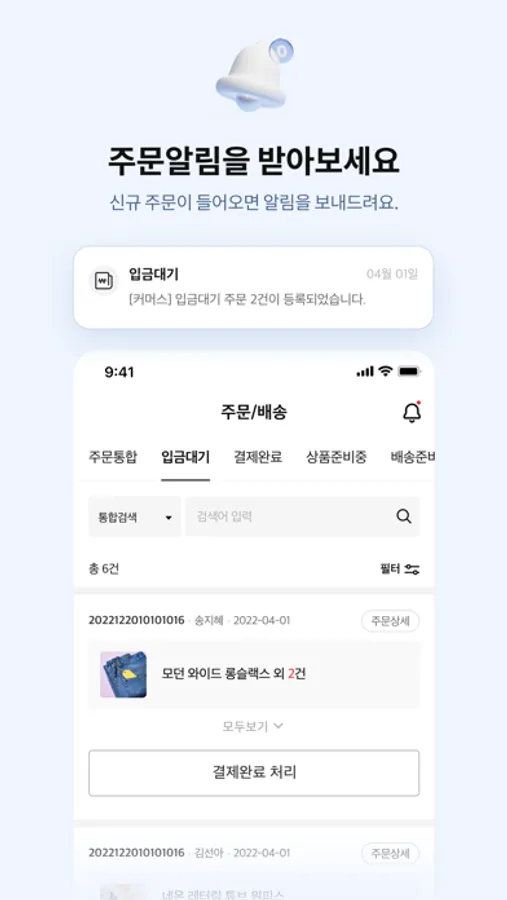 - 입금대기와 결제완료 주문이 들어오면 푸시를 보내요. 모바일에서 주문의 상세내역을 확인하고 주문처리를 할 수 있어요.