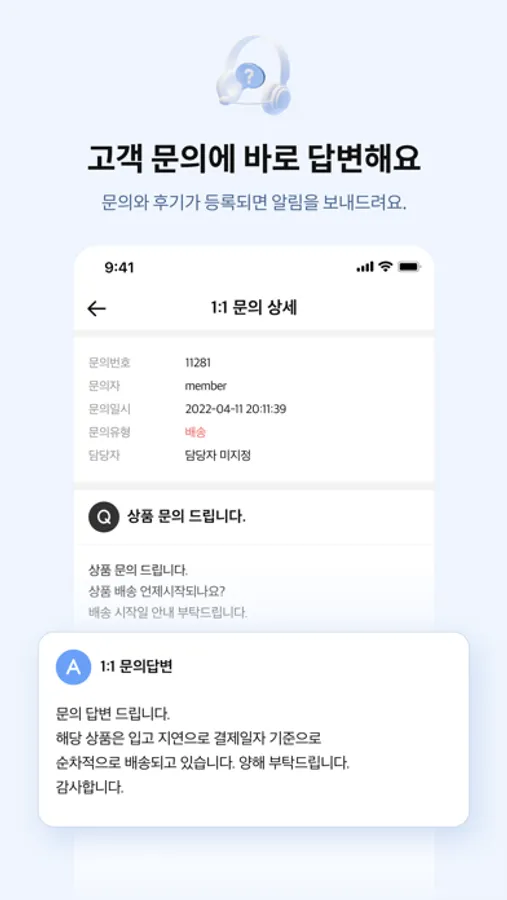 - 상품문의와 1:1문의가 들어오면 푸시를 보내요. 모바일에서 바로 내용을 확인하고 답변 할 수 있어요. 빠른 CS 대응으로 고객 친화적인 쇼핑몰을 운영해보세요.