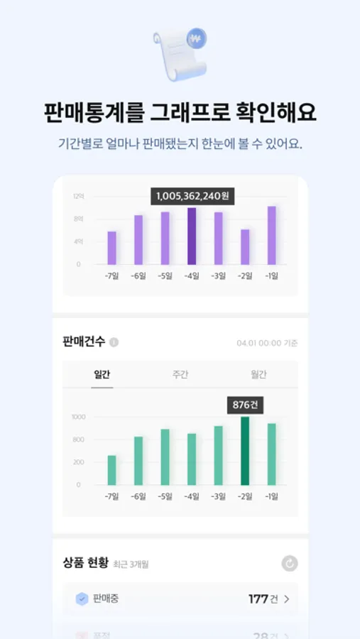 - 기간별로 얼마나 판매됐는지 그래프로 한 눈에 확인해보세요. 결제금액은 물론 판매건수에 대해서도 확인이 가능합니다.