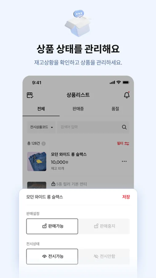 - 등록된 상품의 상태를 변경할 수 있어요. 갑작스레 상품 판매를 중지해야 할 때, 쇼핑몰에 전시를 잠시 중단하고 싶을 때 언제든 상품의 상태변경이 가능해요.