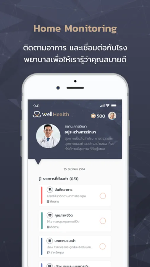 Patients will be received health evaluation from their relevant clinics as scheduled, in order to check if symptoms related to any underlying diseases or caused by a disease or medicine side effects*. The app will analyze symptoms and provide healthcare advices, which save time and difficulties from traveling to see doctors at hospitals.