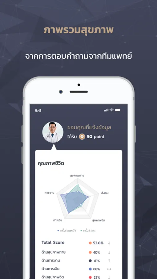 • Evaluate quality of life by analyzing your data based on Well Health database, and reveal your overall health condition if any irregularities found or the risks of developing diseases caused by health behaviors or Non-communicable diseases (NCDs).