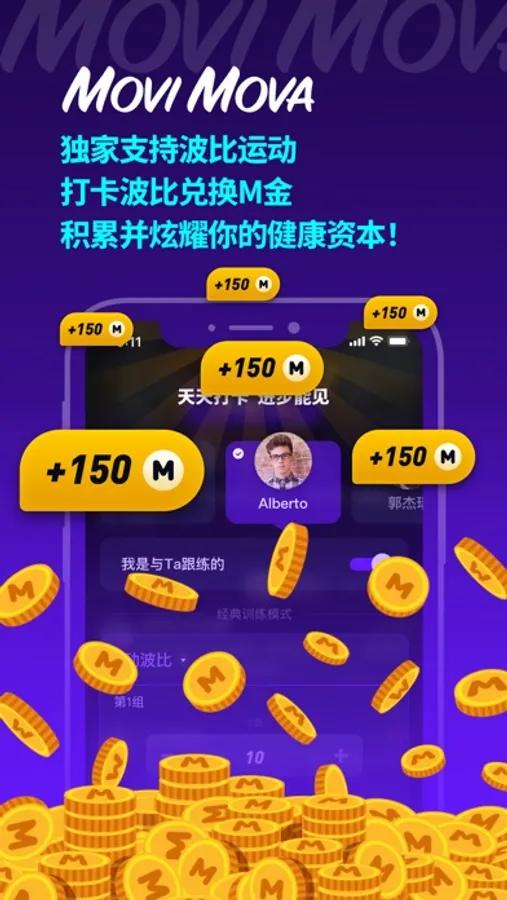 M金(M Gold)是彰显 MoviMover 健身打卡量的重要标志。使用MoviMova 每打卡记录1个波比,便可获得1M金。积累并炫耀自己的健康资本,从未如此简单!