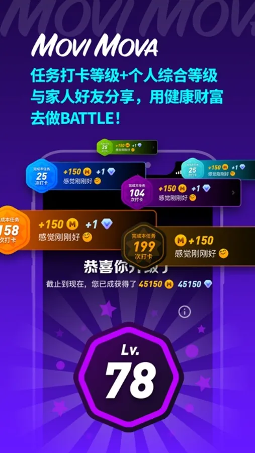 除了参与健身任务打卡,积极投身于 MoviMova 社区,比如邀请好友一起打卡、鼓励其他 MoviMover 等行为,有助于提升 MoviMover 在 MoviMova 社区中的个人综合等级。更高的等级,将助你站上未来世界健身达人的舞台!