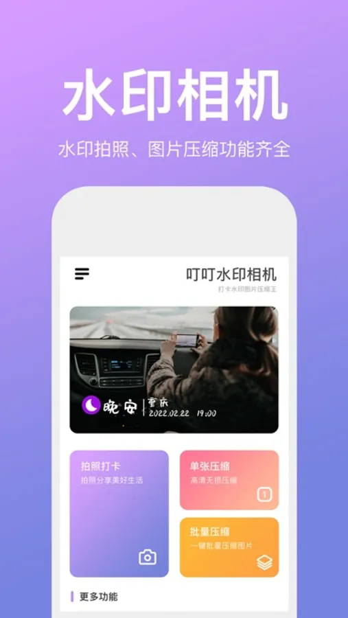 一款可以添加工作水印拍照和编辑图片的拍照打卡工具app,主要功能包括添加生活工作水印、缩小图片大小,节省空间,支持多张照片同时压缩。