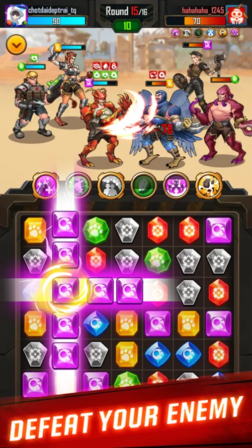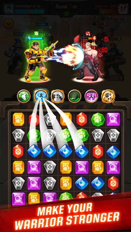 - One turn will complete when each player finishes matching the gem and the warrior finishes attacking. Before the turn completed, the player can activate skill to attack or defend without affecting their turn.
