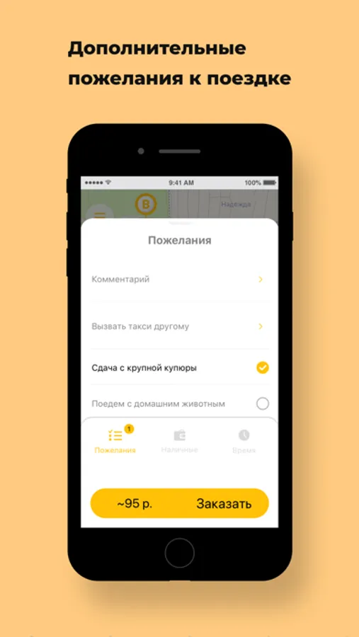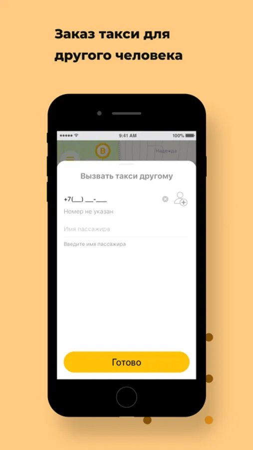 Используйте опцию “Вызвать такси другому” в разделе “Пожелания” и укажите его номер телефона. Когда такси подъедет, на указанный номер придет СМС, а вам — сообщение в приложении.