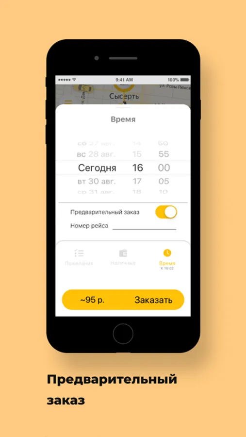 Выберите опцию “Предварительный заказ”. Поиск автомобиля начнется незадолго до заказа поездки, и автомобиль приедет к назначенному времени. Также вы будете заранее знать стоимость поездки.