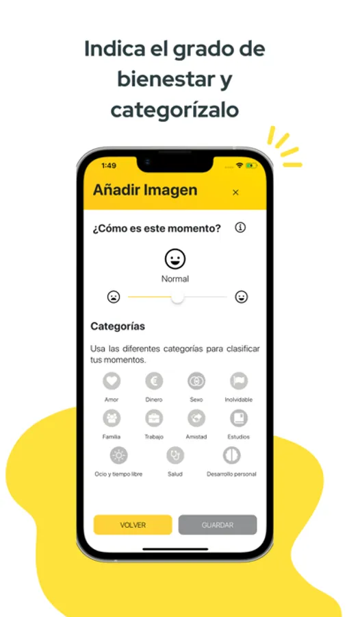 - Una “curva del bienestar” con la que podrás saber de un vistazo la evolución de tu estado emocional día a día y mes a mes, y recordarlos en el futuro.