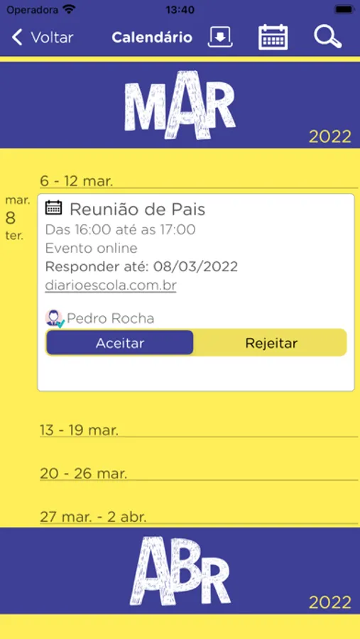 * Calendário: verifique o dia e o horário das atividades da escola. Acompanhe a data das provas e trabalhos. Seja avisado assim que receber um novo convite e receba um lembrete quando uma atividade estiver próxima. Informe sua participação aos professores aceitando ou rejeitando os convites.