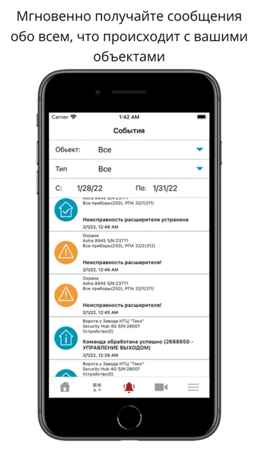 - уведомления о вторжениях, возгораниях, аварийных ситуациях;