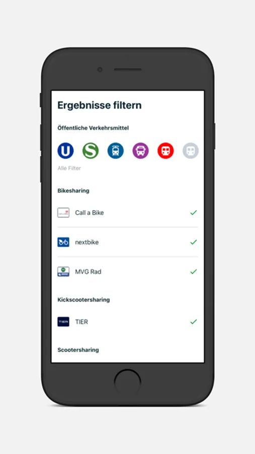 • Multimodal: Die Auskunft umfasst die Sharing-Angebote von ShareNow, Miles, Tier, Call a Bike, nextbike, MVG Rad München