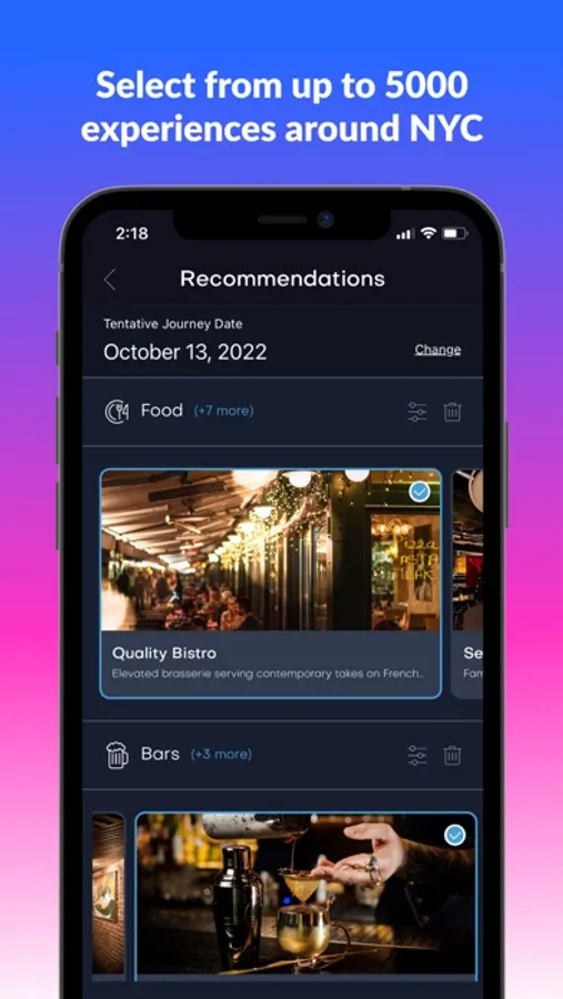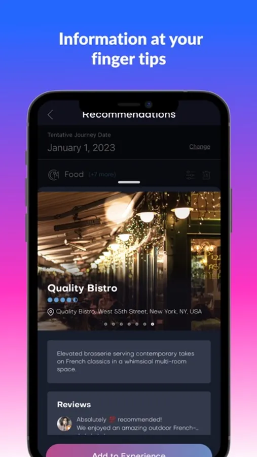 Swipe through a treasure trove of awe-inspiring experiences. Our Discover feed entices you with previews of NYC's culinary scene.