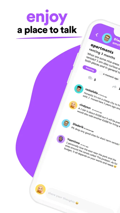 With Heartstring, you can start or join small conversations on things that interest you in no time. Ask questions or start your own mini-topics and exchange thoughts with others in short chats that only people within your location can see. You can set your location to any location you choose, whether it’s a city, festival, or island so you can see who else is nearby and join in on the conversation.