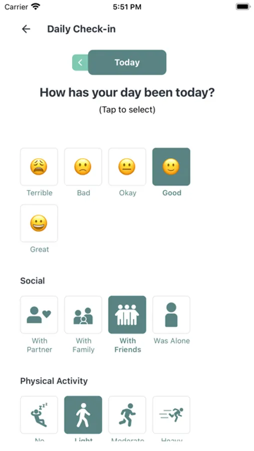 Beyond using your Alpha-Stim, there are other activities that have an impact on mental health. With daily check-ins, you can keep a journal of your activities and mood without having to type a single line.