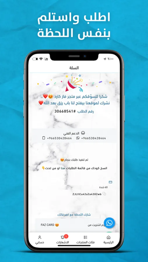 الدعم الفني : متاح عن طريق التطبيق وعن طريق الواتس اب على مدار الساعة.