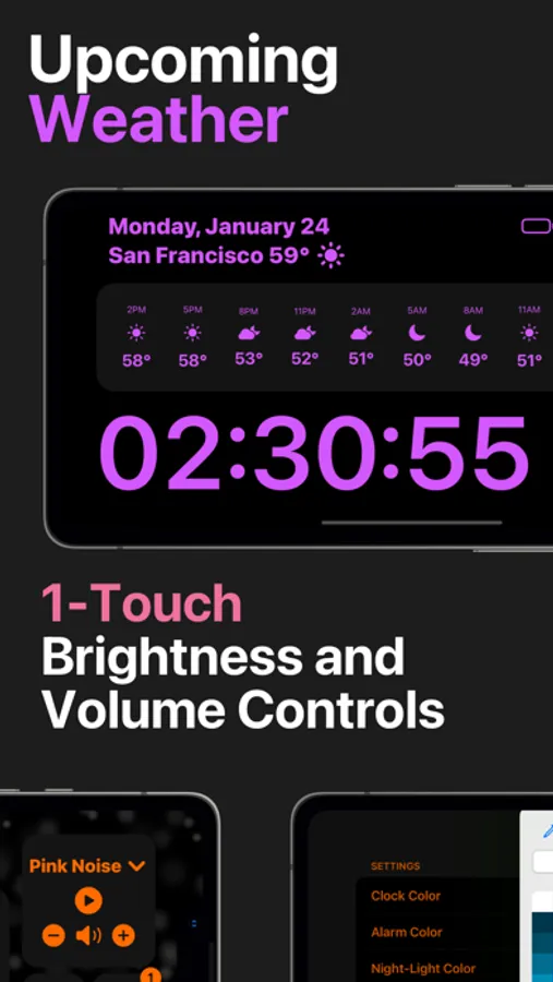 • Choose your favorite color for the clock, alarm, and the night-light.