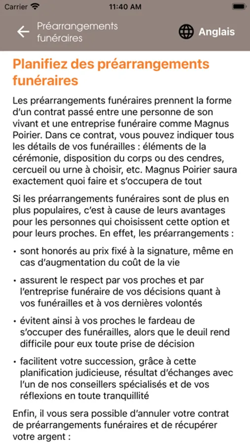 Magnus Poirier est un utilitaire présentant les produits ainsi qu'une connexion pour pouvoir simplifier les étapes lors d'un décès.