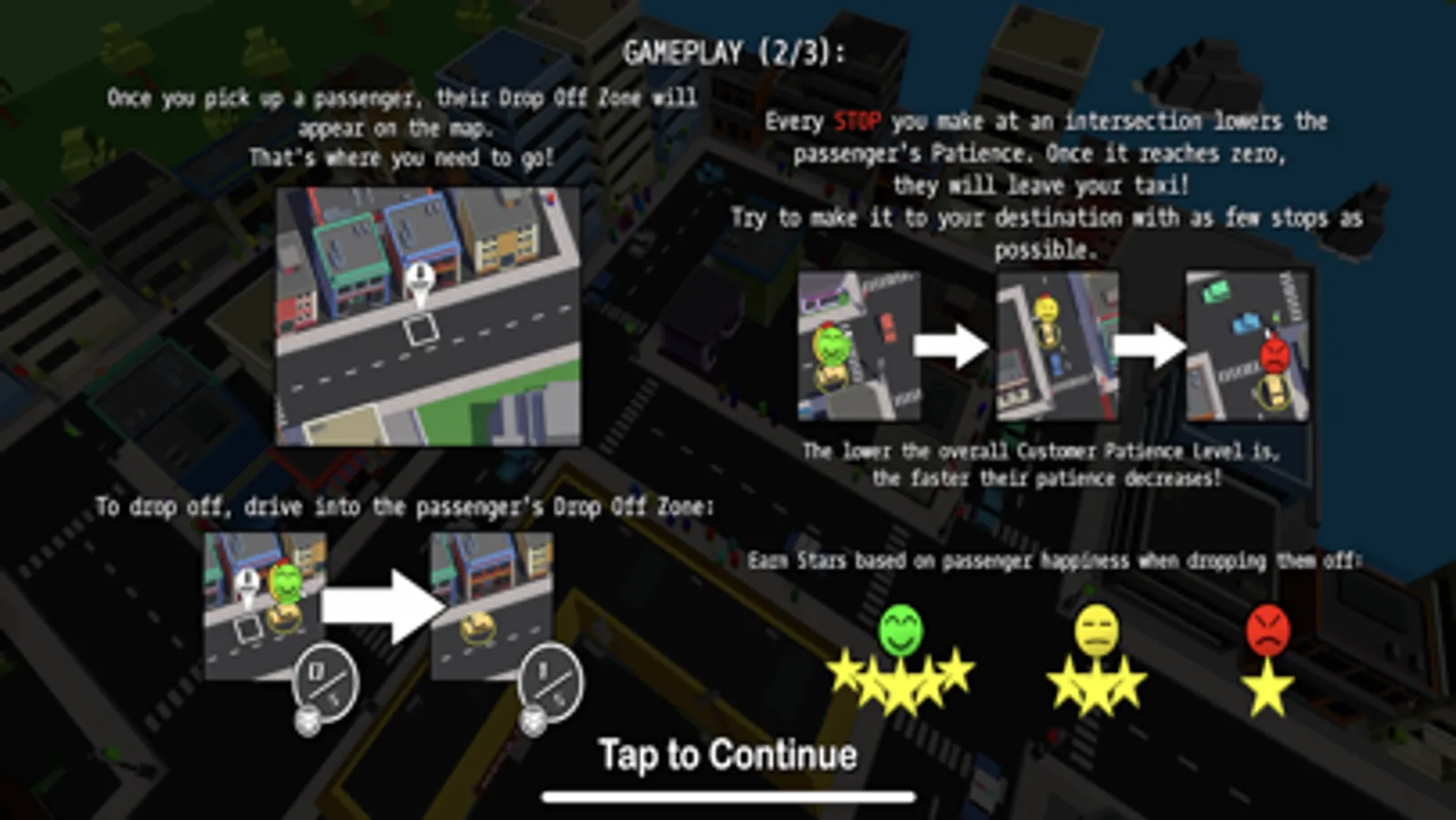 Pick up your passengers at the designated pick up location before other competing taxis try to get to them first. Then try to get the passengers to their drop off location, avoiding traffic, road blocks, and drawbridges so they will still give you a decent star rating when you drop them off.