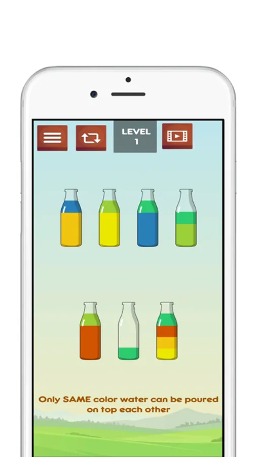 • You can only pour the water if there is same color and quite empty space in the bottles.