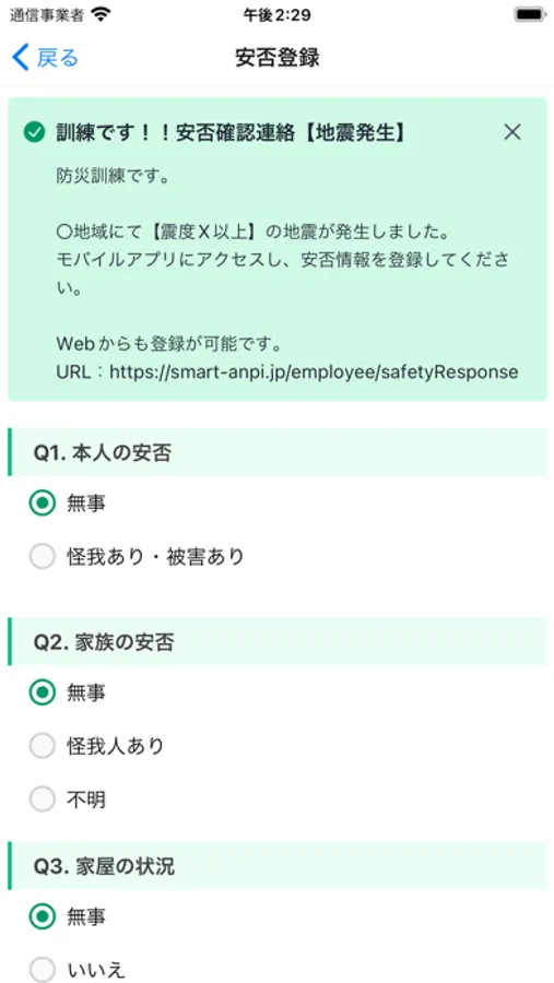また、災害時には事前に設定された閾値に応じて、自動で安否確認の通知を行います。
