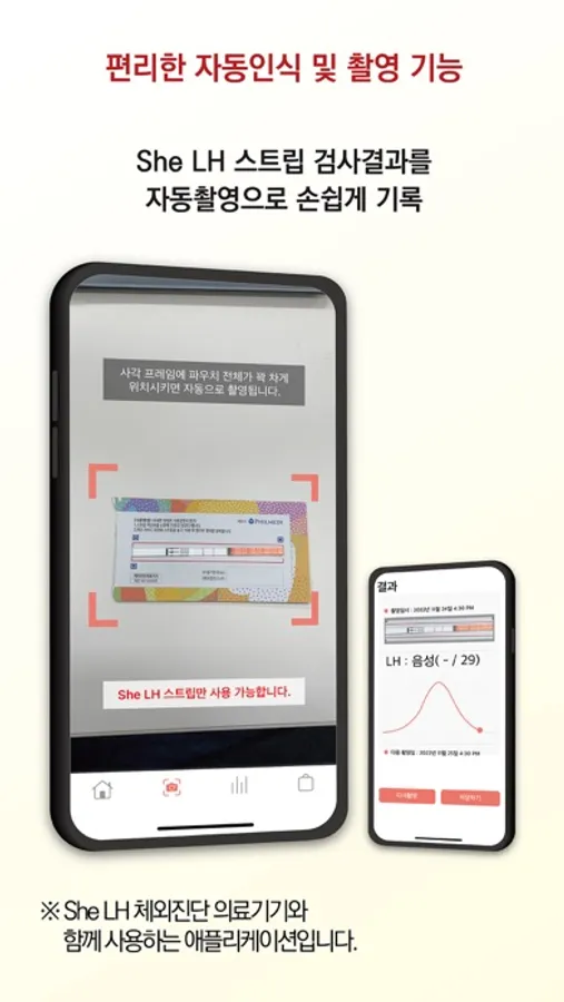 - She 생리주기테스트기로 검사하신 후 보다 정확한 결과 확인을 위하여 She 앱을 이용하실 수 있습니다.