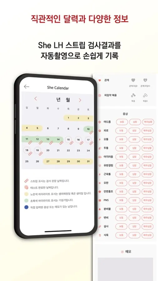 - She 생리주기테스트기로 검사한 결과 확인, 저장, 기록을 할 수 있습니다.