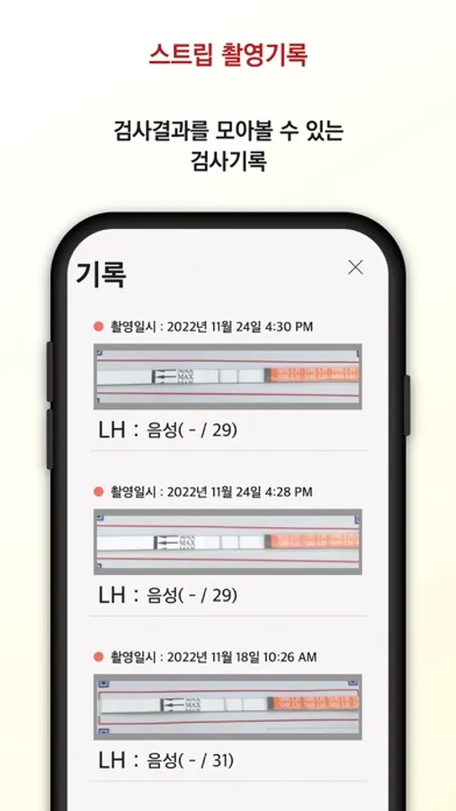 - 황체형성호르몬은 배란 시기에 급격히 상승하며 스트립의 검사선이 대조선과 같거나 더 진하게 나타납니다.