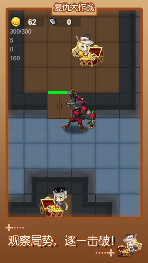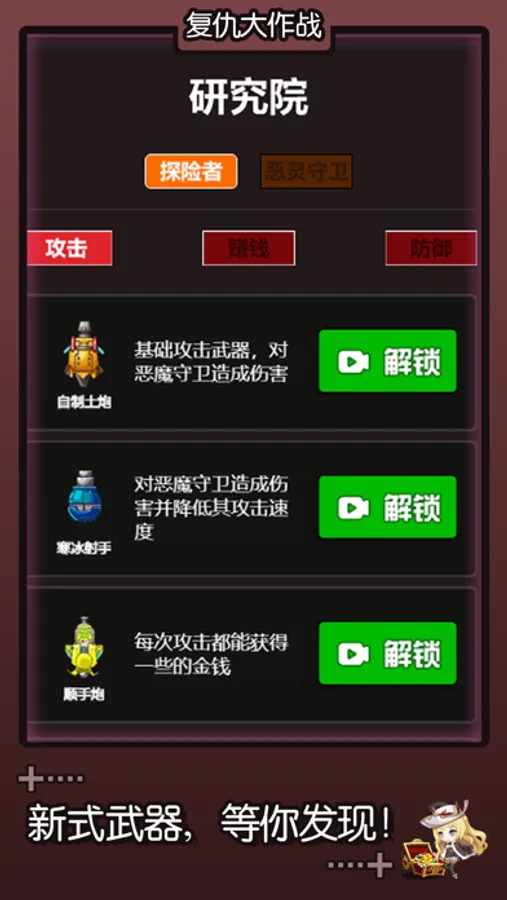 《复仇大作战》是一款2D策略塔防小游戏。游戏中探险者需躲避恶魔守卫的追捕,寻找适合自己的堡垒躲避,并发展经济建造炮台,抵御恶魔守卫。游戏中探险者只可以在房间中的空地板上进行建造,点击空地板后,出现建筑菜单。游戏中探险者需要根据自己当前的经济选择性建造建筑,发现一条符合自己发展的道路。探险者需要将恶魔守卫击败可获胜,反之恶魔守卫抓到探险者则探险者失败。