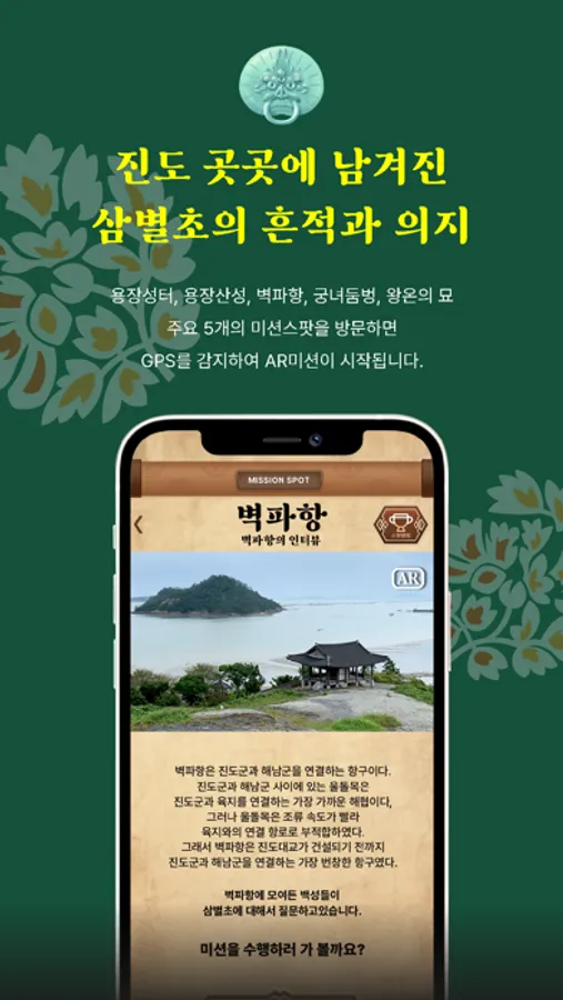 ∎ 진도 삼별초 AR 미션투어는 몽골과 끝까지 항쟁한 삼별초의 흔적을 찾고 증강현실 게임을 통해 당시 삼별초들의 의지를 경험해볼 수 있는 역사교육/ 관광 연계 게임 어플리케이션입니다.
